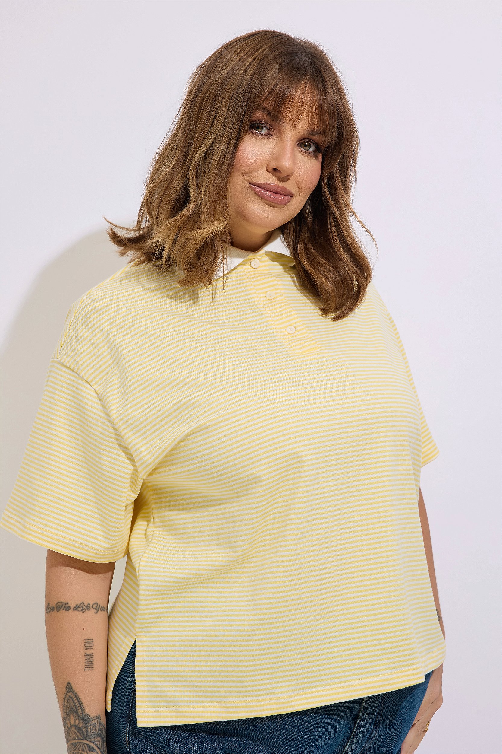 Leve, delicada e atemporal, a Blusa Polo Manga Curta Listrada Amarela é perfeita para compor looks frescos e charmosos. Confeccionada em malha macia, possui listras fininhas em amarelo e off, que criam um visual sutil e elegante. A gola polo na cor off traz um contraste discreto e sofisticado, valorizando ainda mais a peça. Com modelagem confortável e toque suave, é ideal para o dia a dia ou produções casuais com um toque refinado. Fica linda com jeans, branco ou tons naturais.