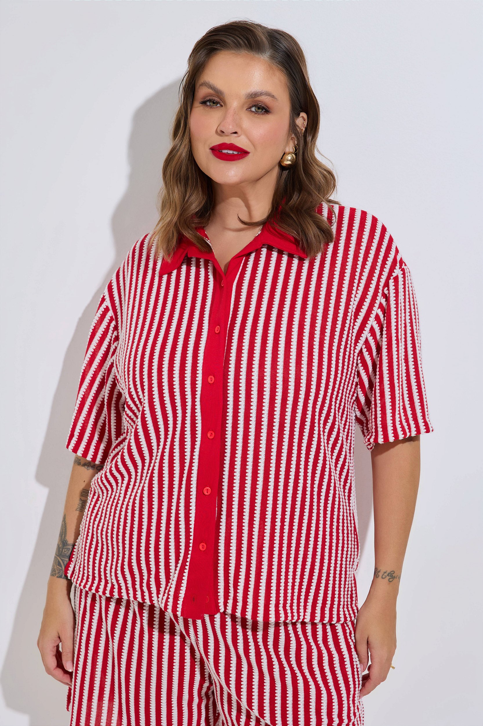 Com mangas curtas, gola polo e fechamento frontal por botões, ela mistura casualidade com estilo moderno, enquanto as listras em vermelho e branco adicionam atitude e presença. Uma peça versátil que funciona bem sozinha ou em sobreposições.