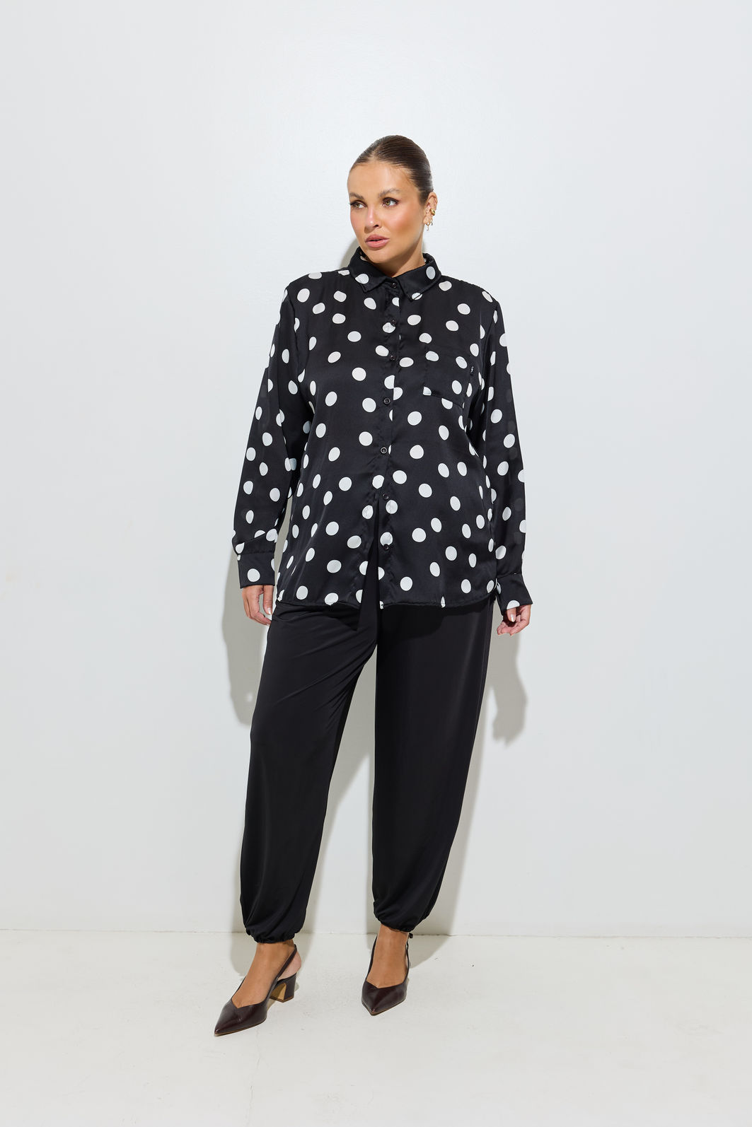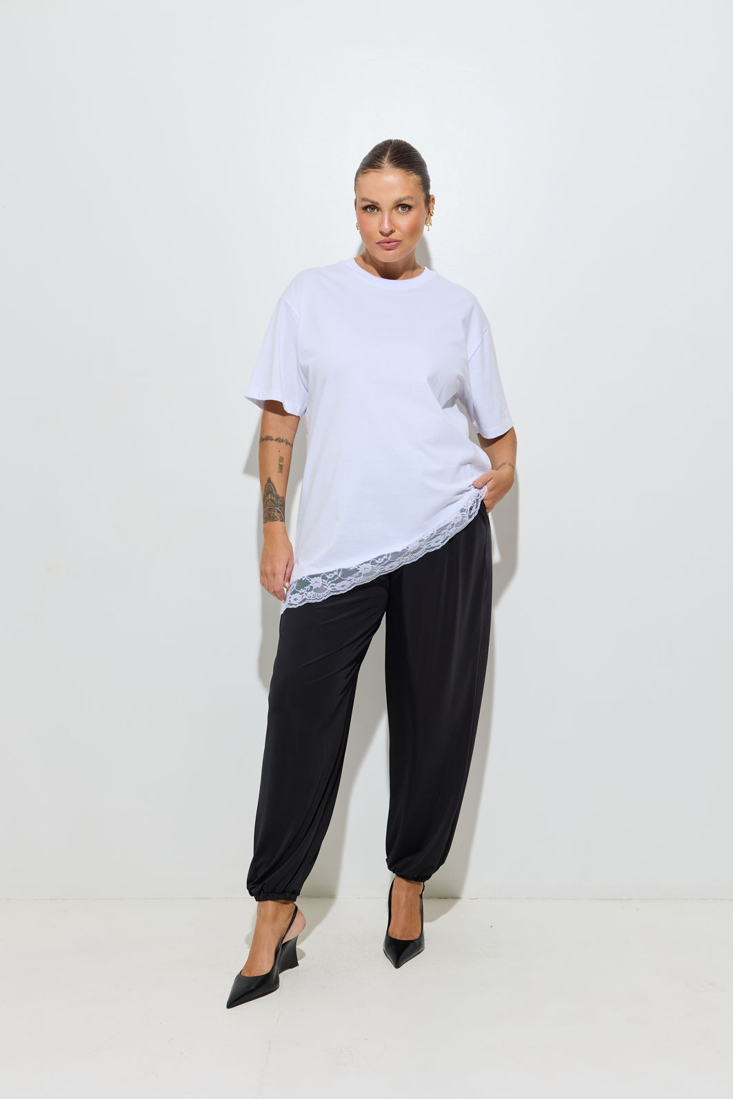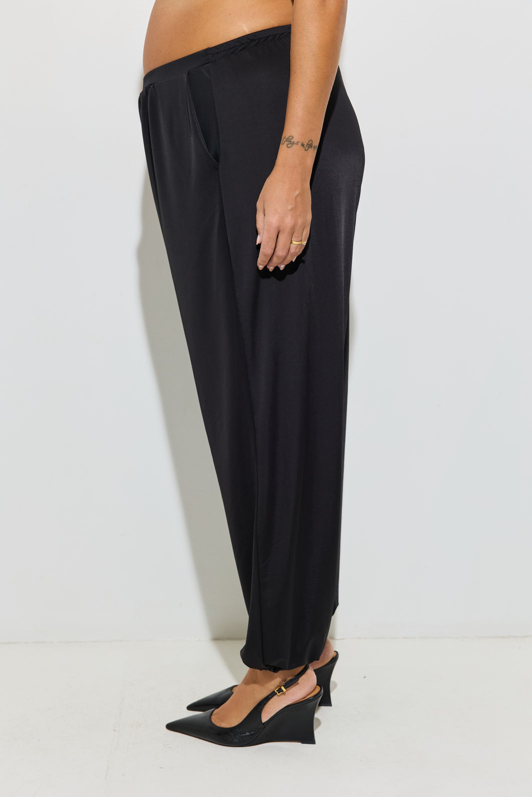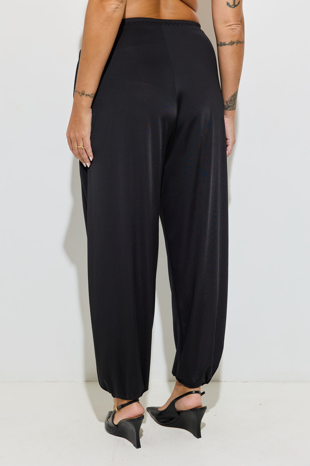 A Calça Aladim Preta aposta na silhueta balonê volumosa no comprimento e com leve ajuste na barra criando um shape atual e cheio de atitude.