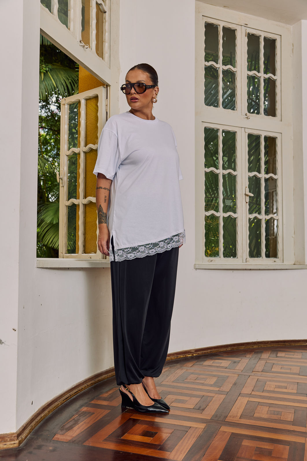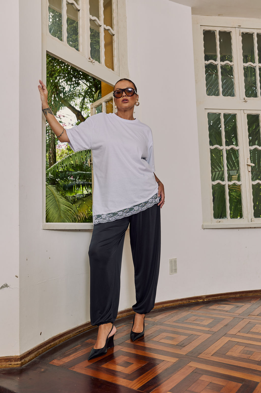 O elástico na barra reforça o shape balonê, trazendo aquele acabamento que deixa o look mais interessante e alinhado com a estética atual.