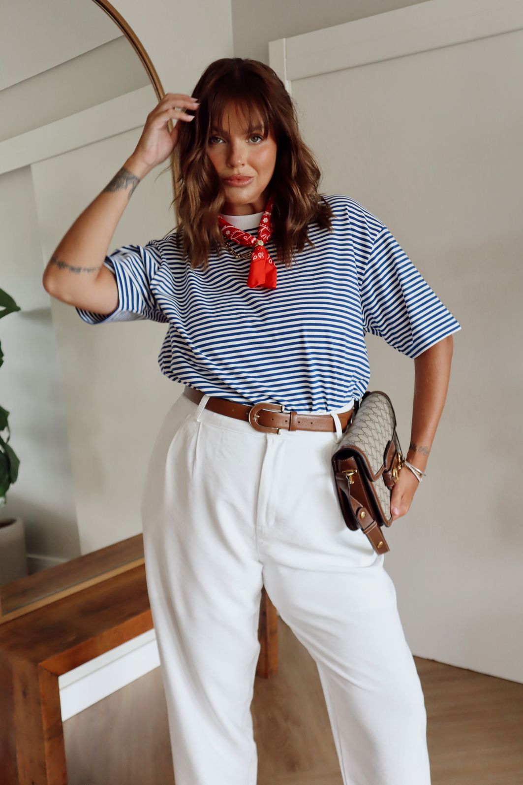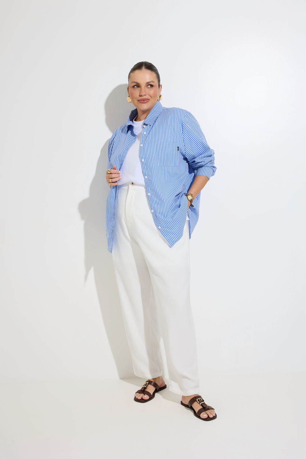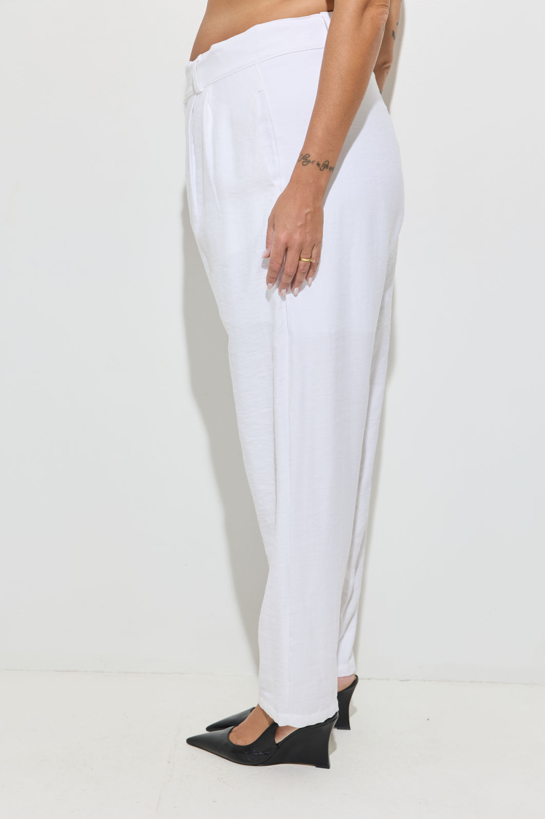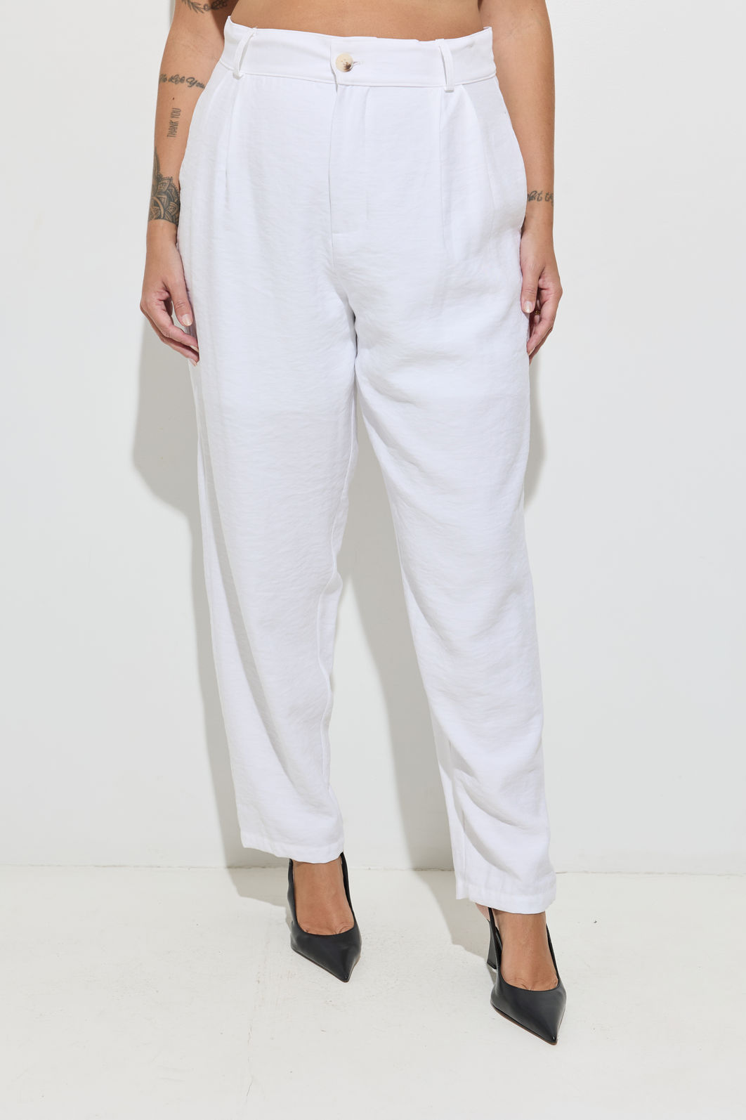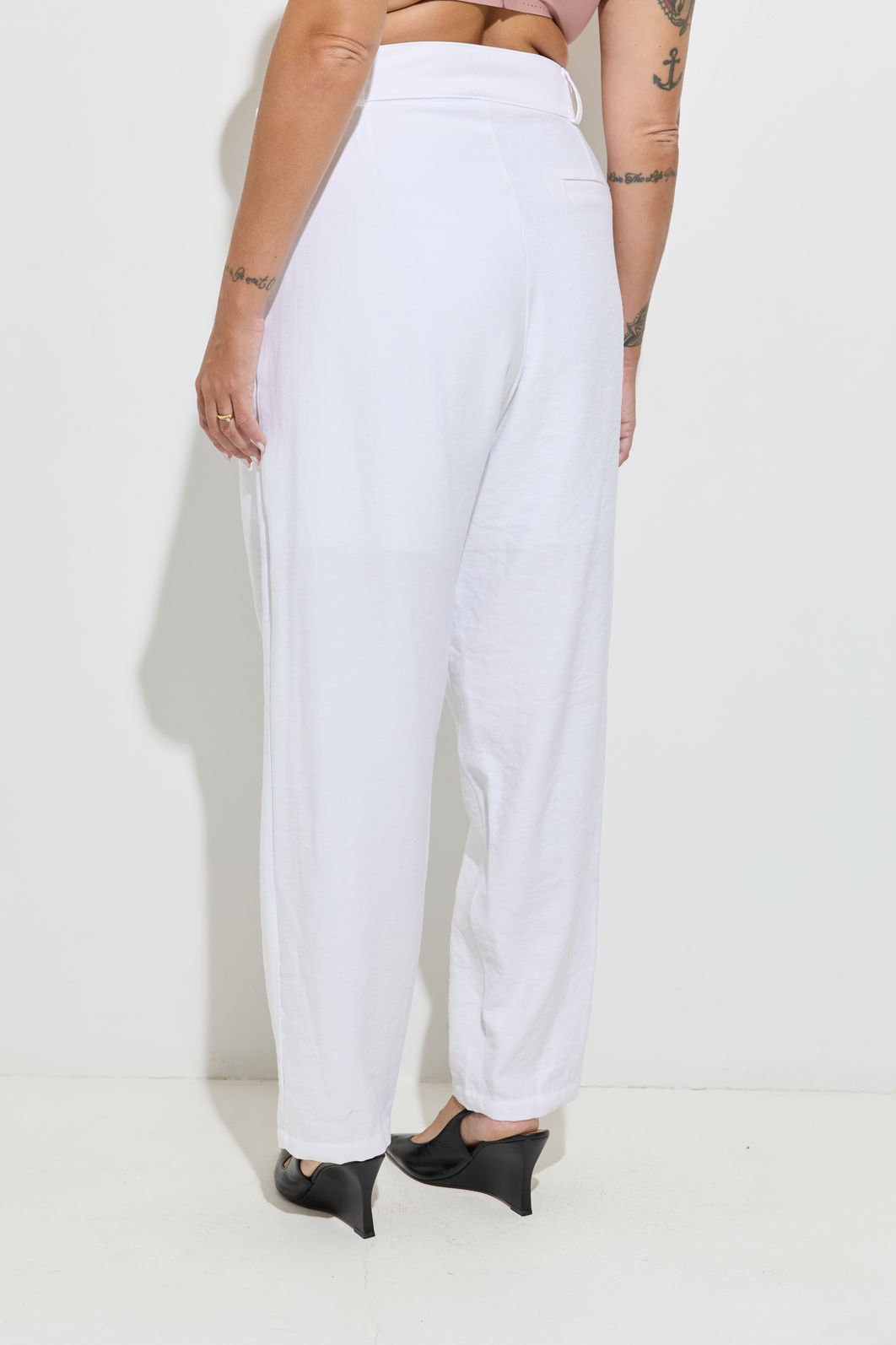 Seu design impecável conta com um cós entretelado, garantindo estrutura e um acabamento alinhado. Os passantes para cinto permitem diversas combinações, enquanto as pregas frontais agregam um toque clássico de alfaiataria. Para um detalhe sofisticado, os bolsos traseiros não funcionais trazem elegância sem comprometer a fluidez do tecido.