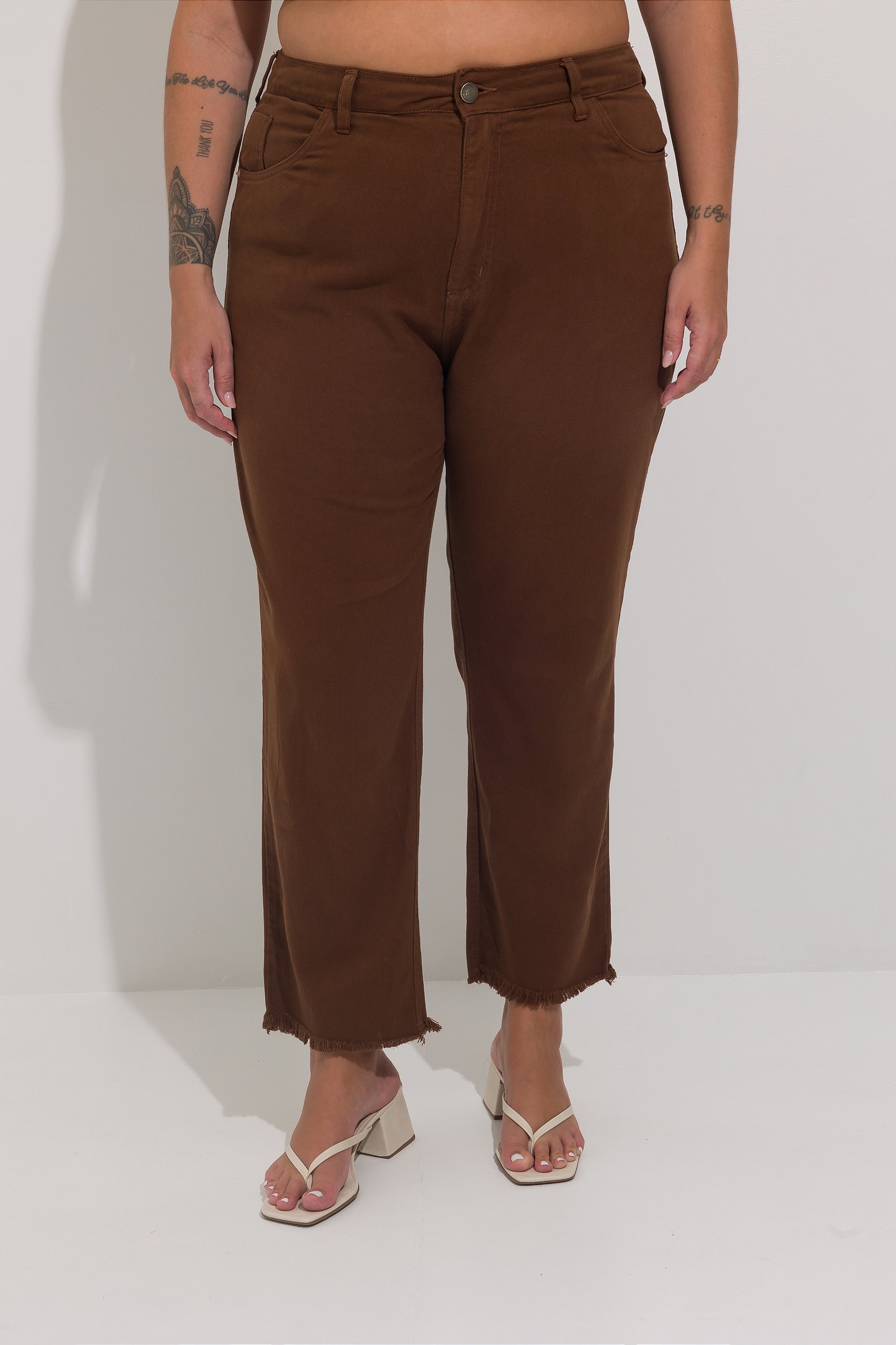 A Calça Bárbara na cor cacau é a escolha perfeita para quem deseja um visual casual chic com um toque de modernidade. Unindo o shape clássico do mom jeans com a sofisticação da calça reta, essa peça garante um caimento impecável e versátil, ideal para diversas ocasiões.