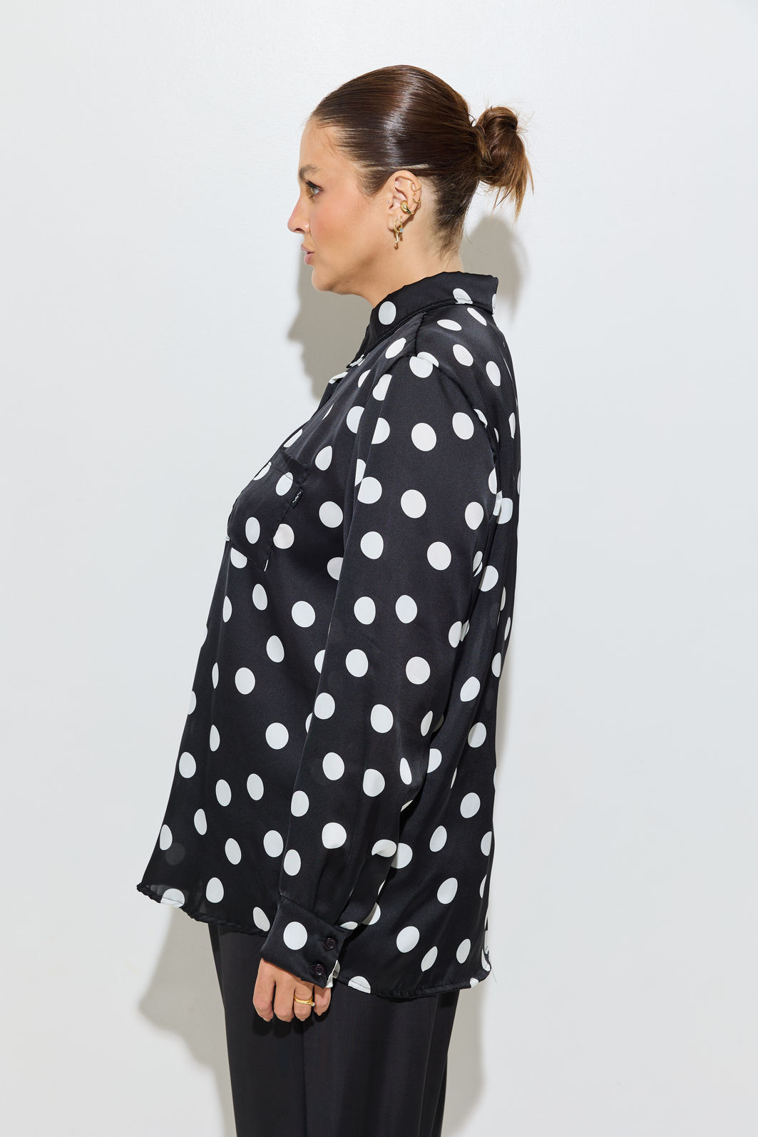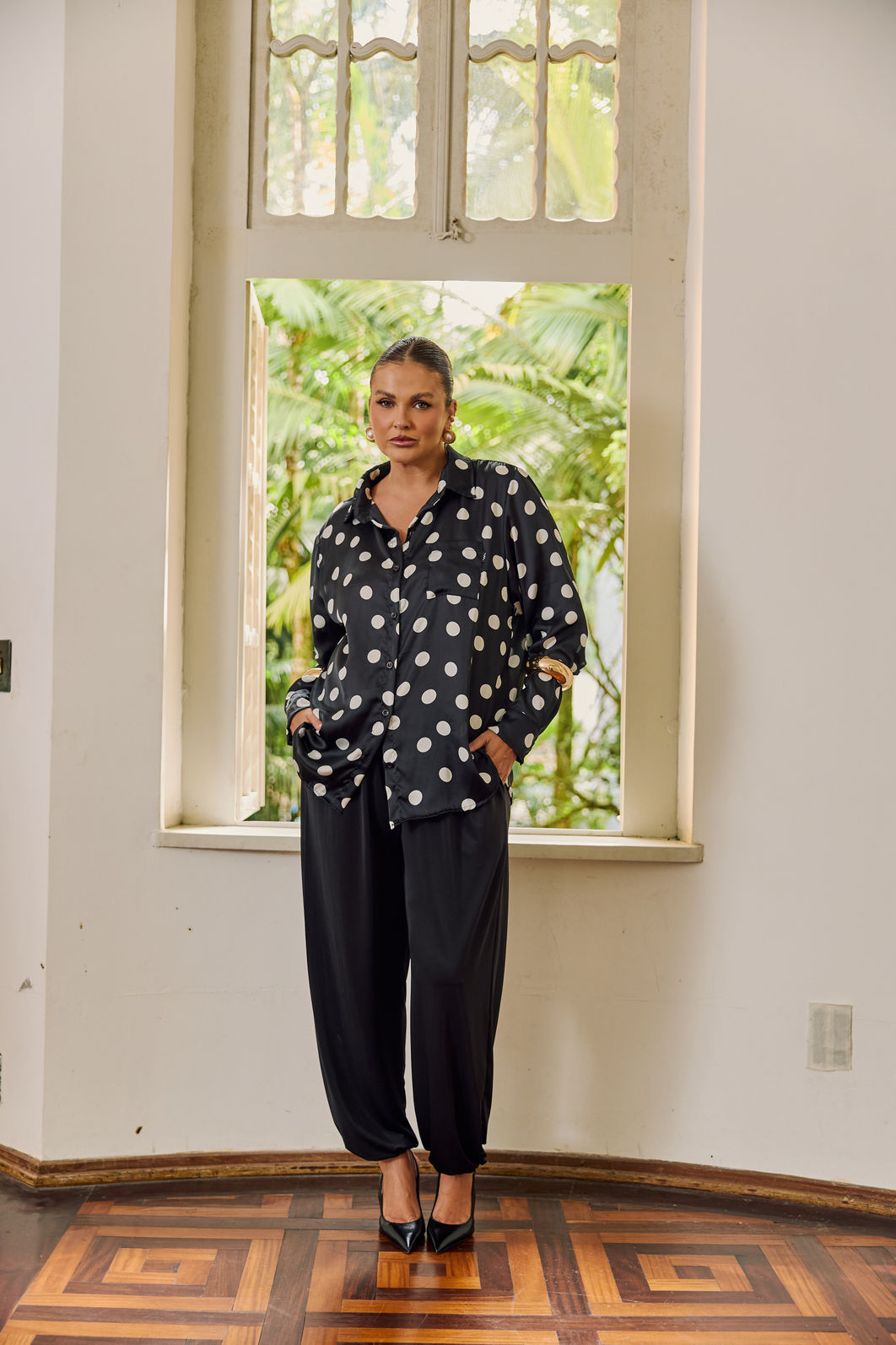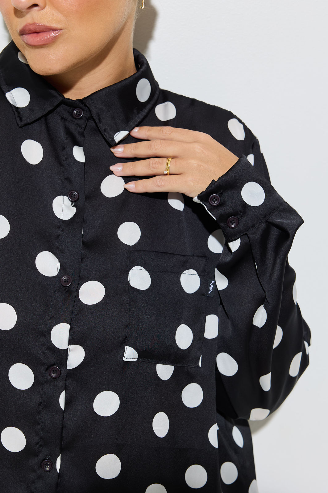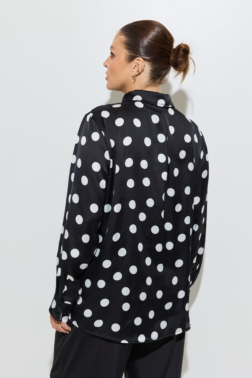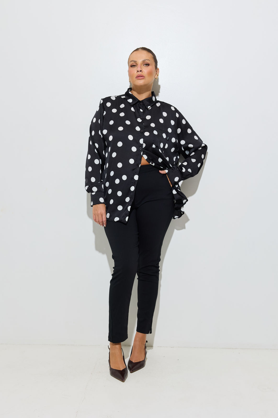O poá aparece renovado na temporada, com versões maiores e mais marcadas, trazendo uma leitura mais atual e fashionista para a estampa clássica. A Camisa Acetinada Poá aposta nesse movimento com poás mais graúdos, criando um contraste forte e cheio de personalidade.