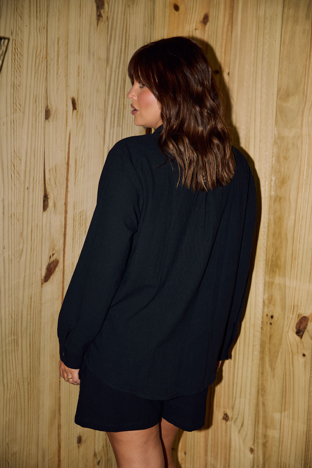 Leve e respirável, proporciona conforto ao vestir e caimento fluido que valoriza o movimento sem marcar. A modelagem clássica com mangas longas e fechamento frontal por botões traz aquele equilíbrio perfeito entre casual e arrumado, permitindo composições atemporais e cheias de estilo.
