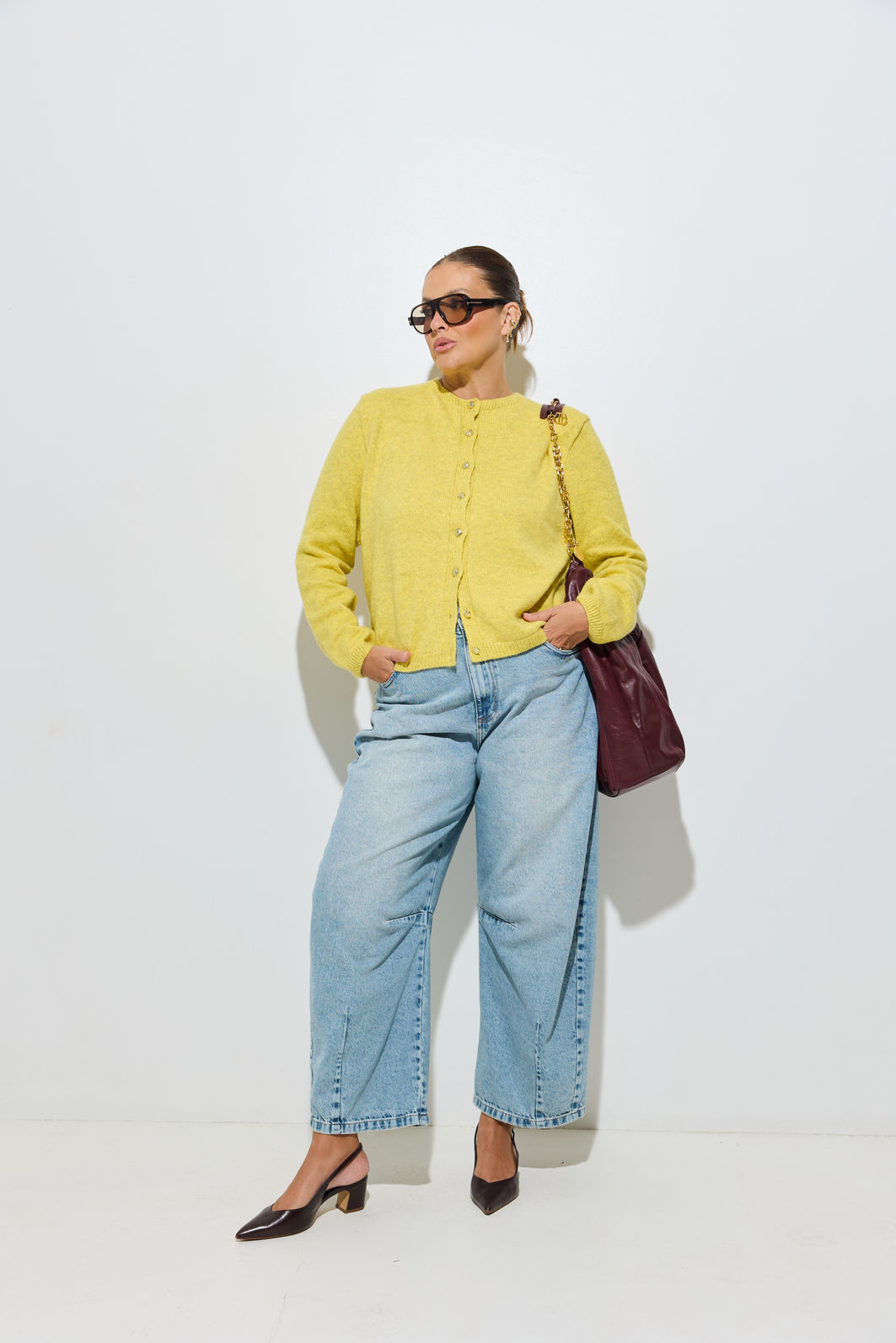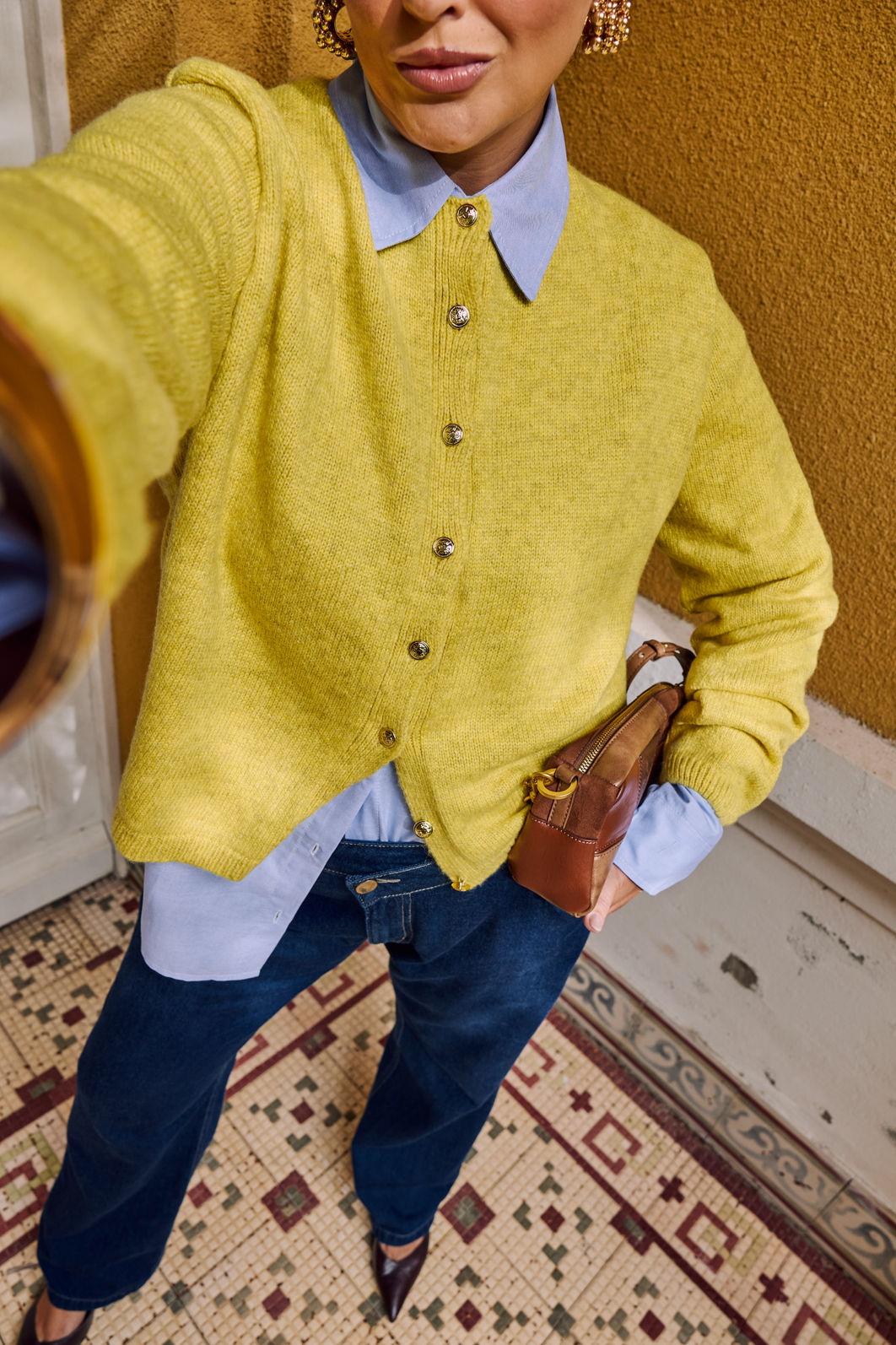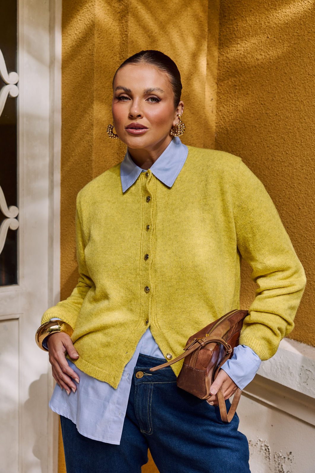 O Cardigan Tricot Amarelo Mescla é aquela peça que ilumina o look na medida certa. Com toque macio e caimento leve, ele envolve o corpo com conforto, trazendo aquecimento sem pesar na produção.