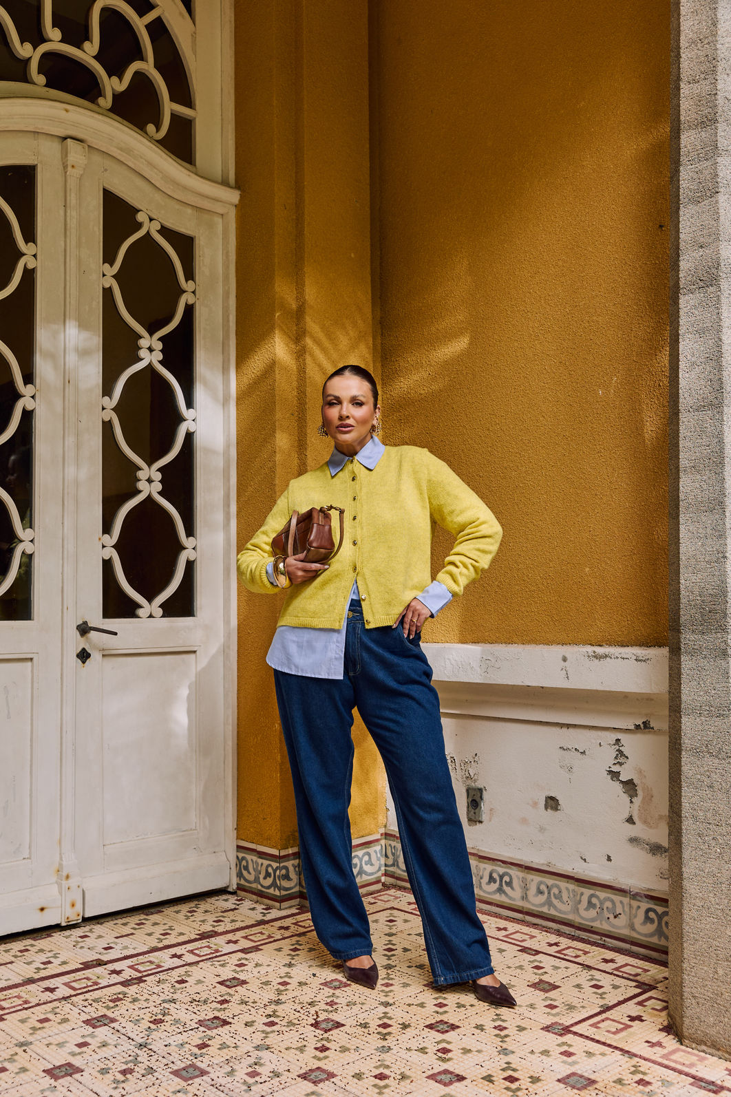 O tom amarelo mescla entra como aquele toque de cor fácil de combinar, perfeito pra sair do básico e deixar o look mais interessante.