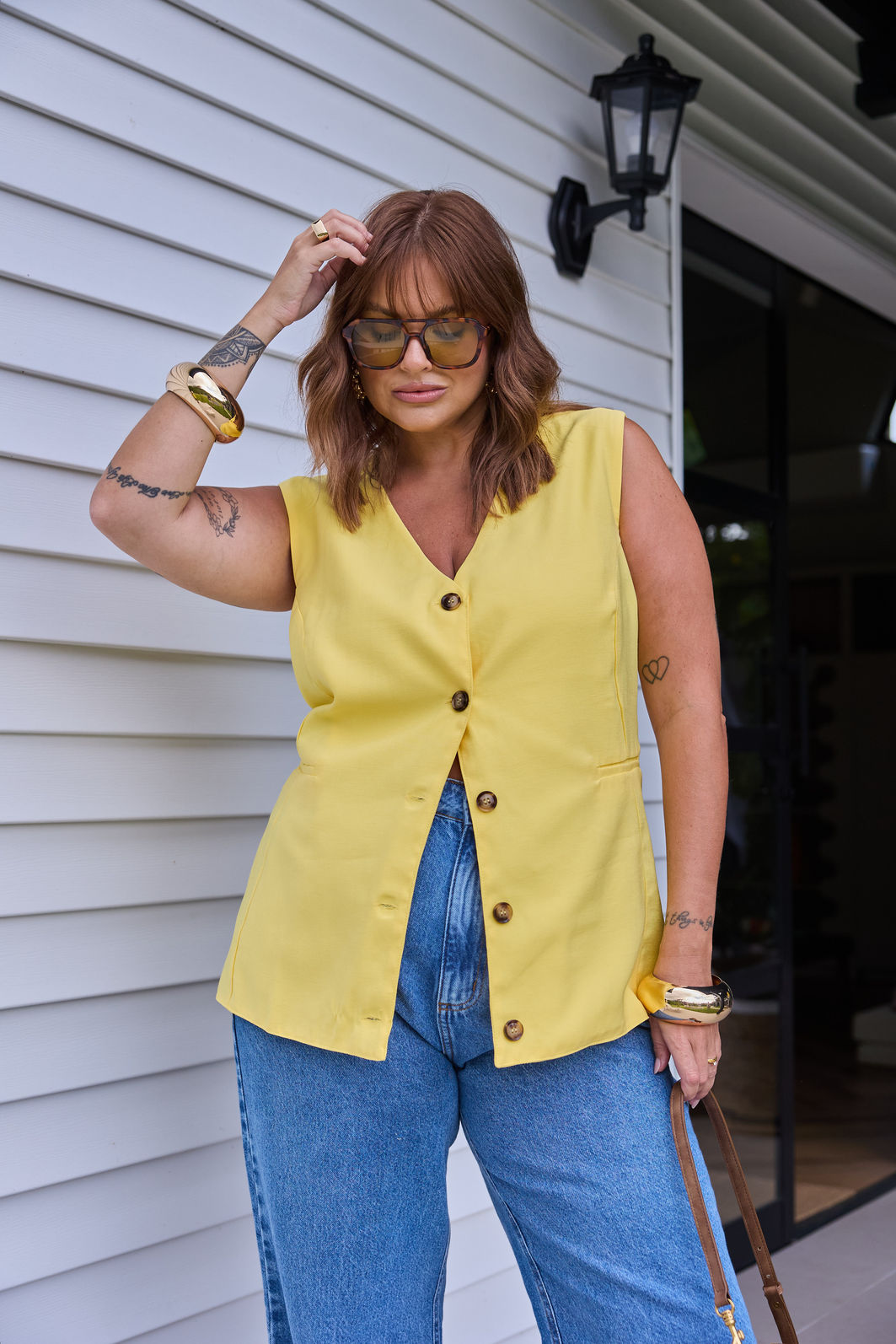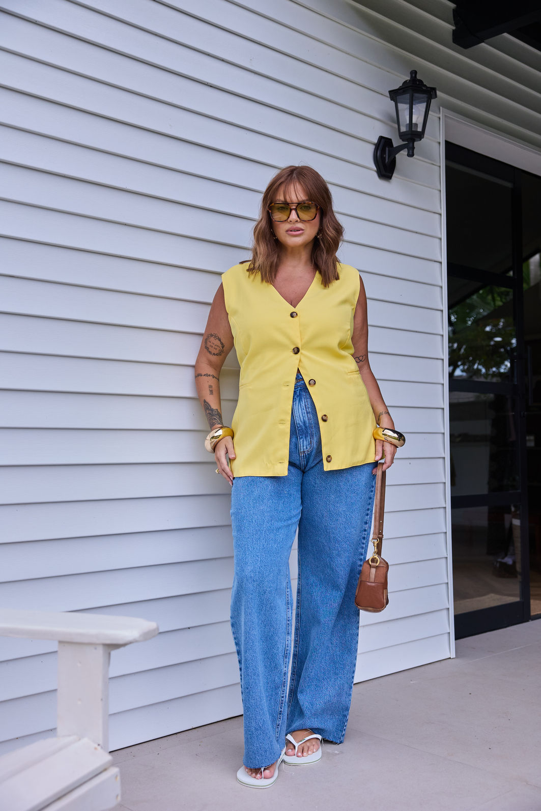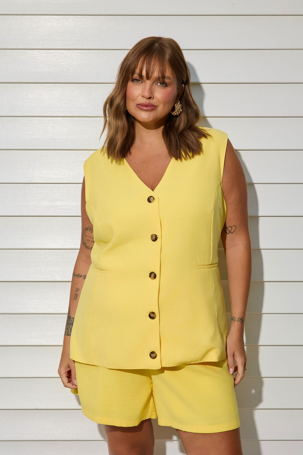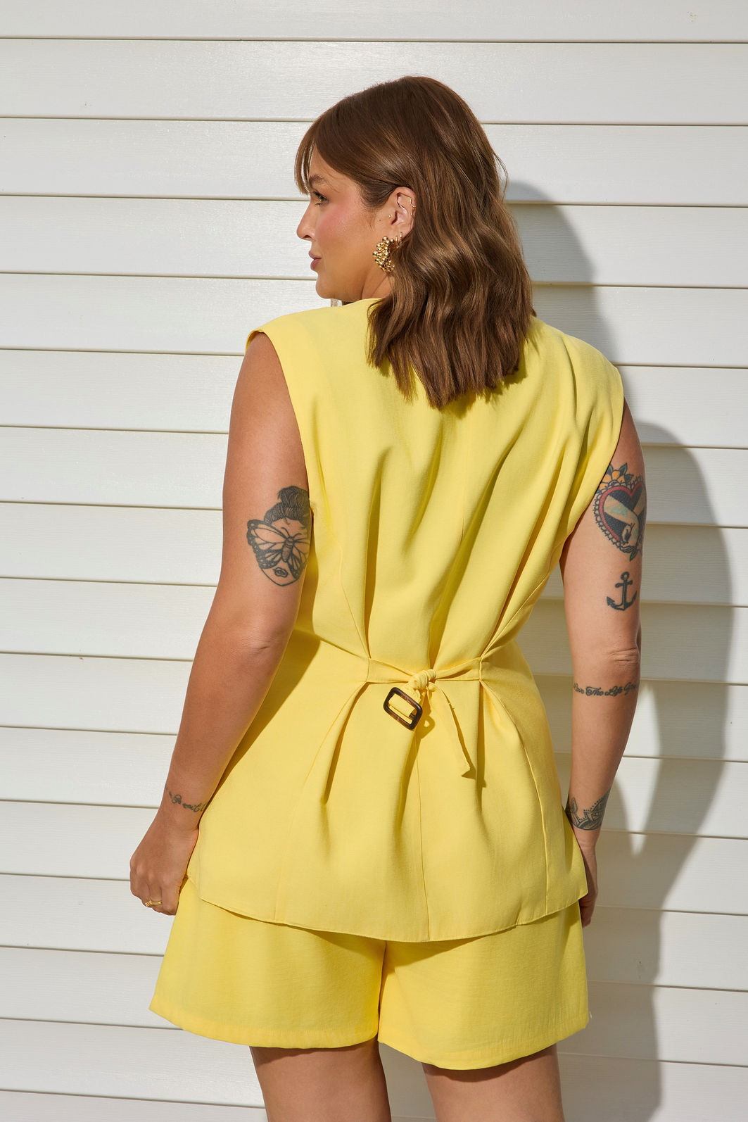 Em um tom amarelo vibrante e sofisticado, o colete pode ser usado sozinho, sobreposto a blusas leves ou combinado com a Bermuda Antônia ou a Calça Salete no mesmo tecido e cor, criando um conjunto coordenado, contemporâneo e cheio de personalidade. Um verdadeiro curinga que transita com facilidade do casual ao chic.