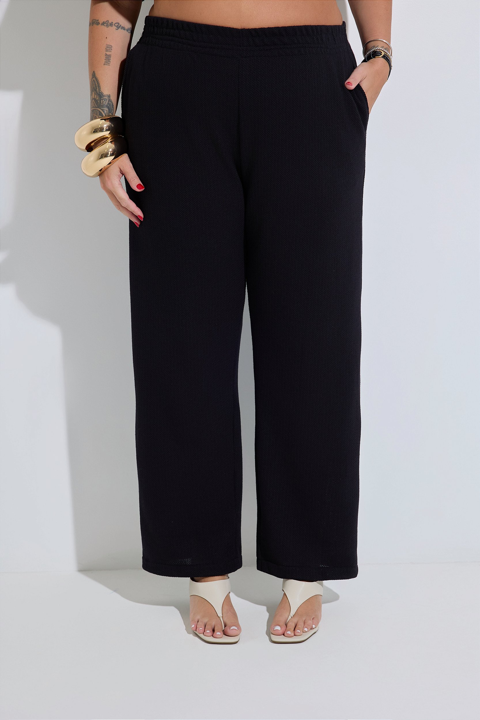 A Calça Pantalona Crochet Preta é a peça ideal para quem busca conforto aliado a um estilo moderno e versátil. Confeccionada em tecido com textura que remete ao crochet, ela se destaca pelo visual diferenciado e atual. A cor preta reforça sua versatilidade, permitindo combinações fáceis e elegantes com diferentes propostas de look.