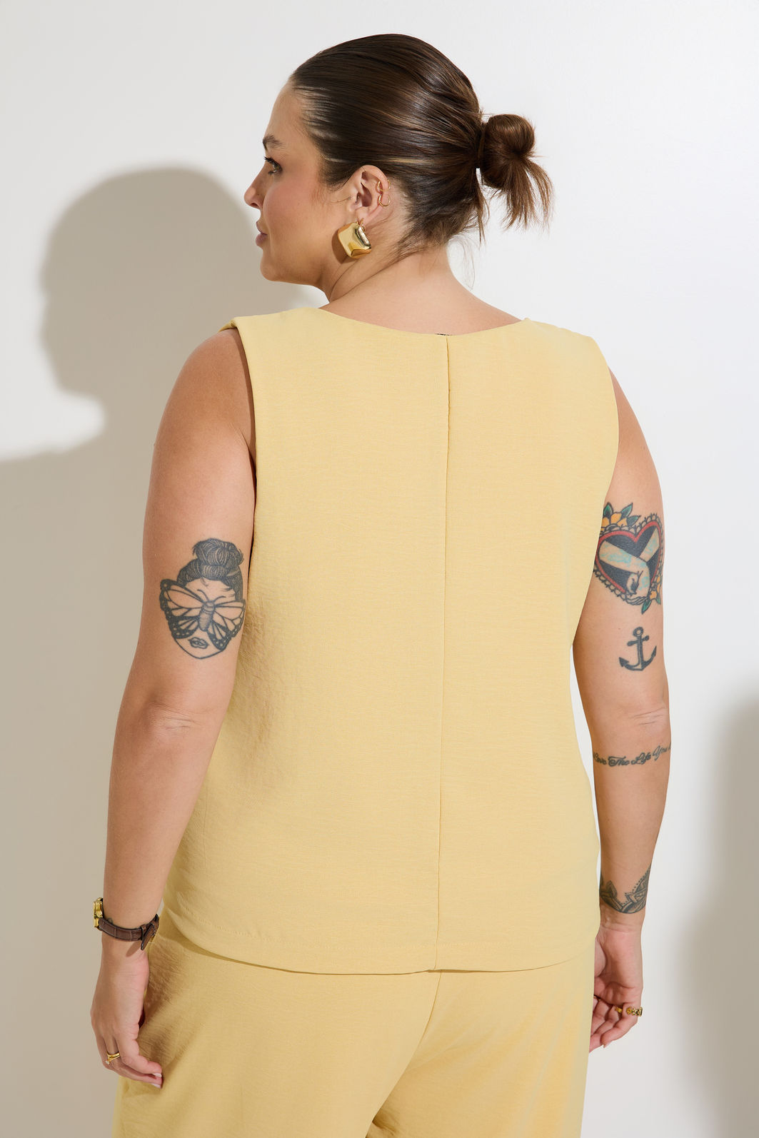 Com decote V que valoriza o colo e alonga a silhueta, a regata é ideal para compor desde produções descomplicadas até visuais mais arrumados. Para um look coordenado, combine com a Calça Cenoura Crepe Amarelo Suave e aposte no conjunto monocromático cheio de frescor. Também funciona perfeitamente com jeans, pantalonas ou saias, garantindo estilo em qualquer ocasião.