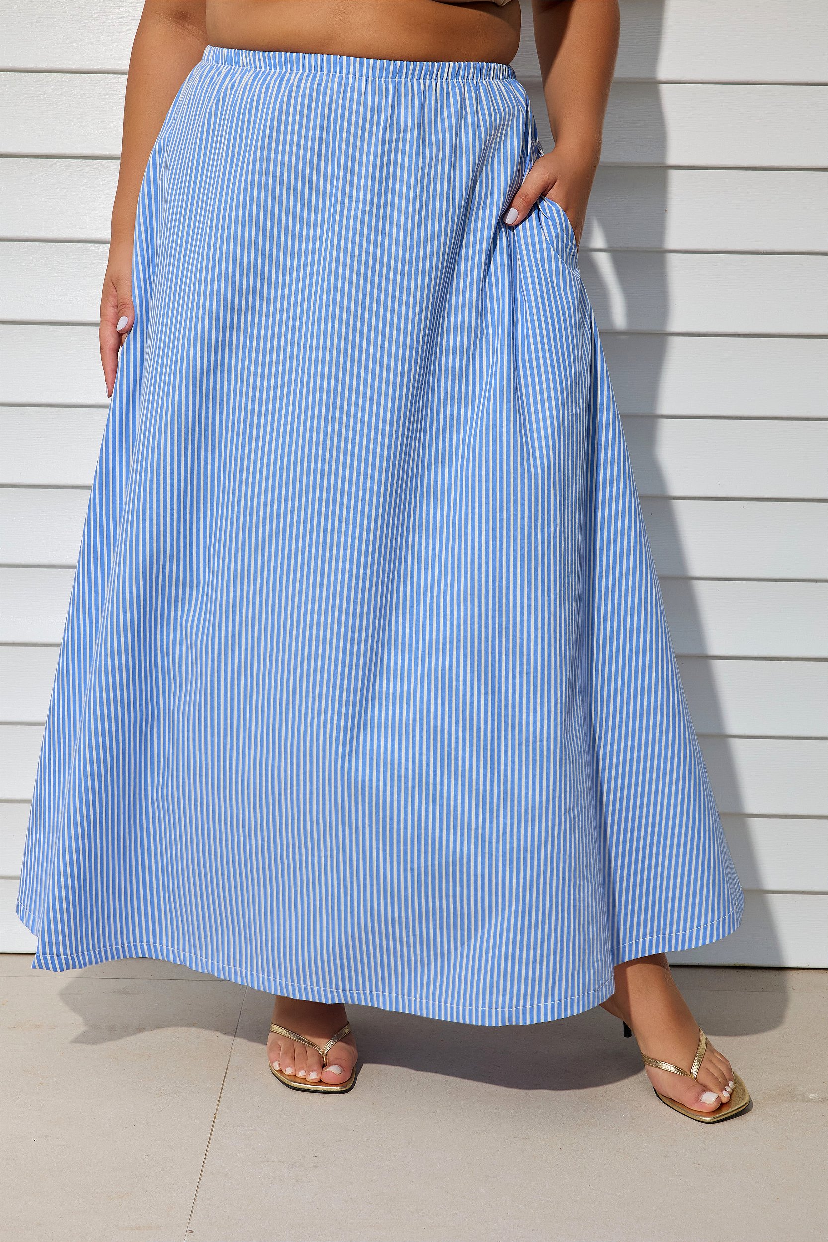 Com comprimento longo e movimento natural, ela valoriza a silhueta com suavidade. O cós com elástico fino oferece ajuste confortável, enquanto as listras em azul e off trazem um visual clássico, luminoso e fácil de combinar.