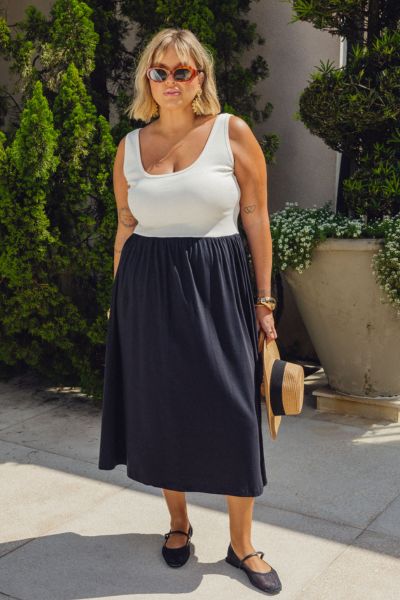 O Vestido Agatha traz o contraste perfeito entre a parte superior off-white e a saia preta, criando um look contemporâneo e sofisticado. A parte de cima, em malha canelada, apresenta um design de regata com alças largas, permitindo o uso de sutiã com total conforto, enquanto a tonalidade off confere frescor ao visual.