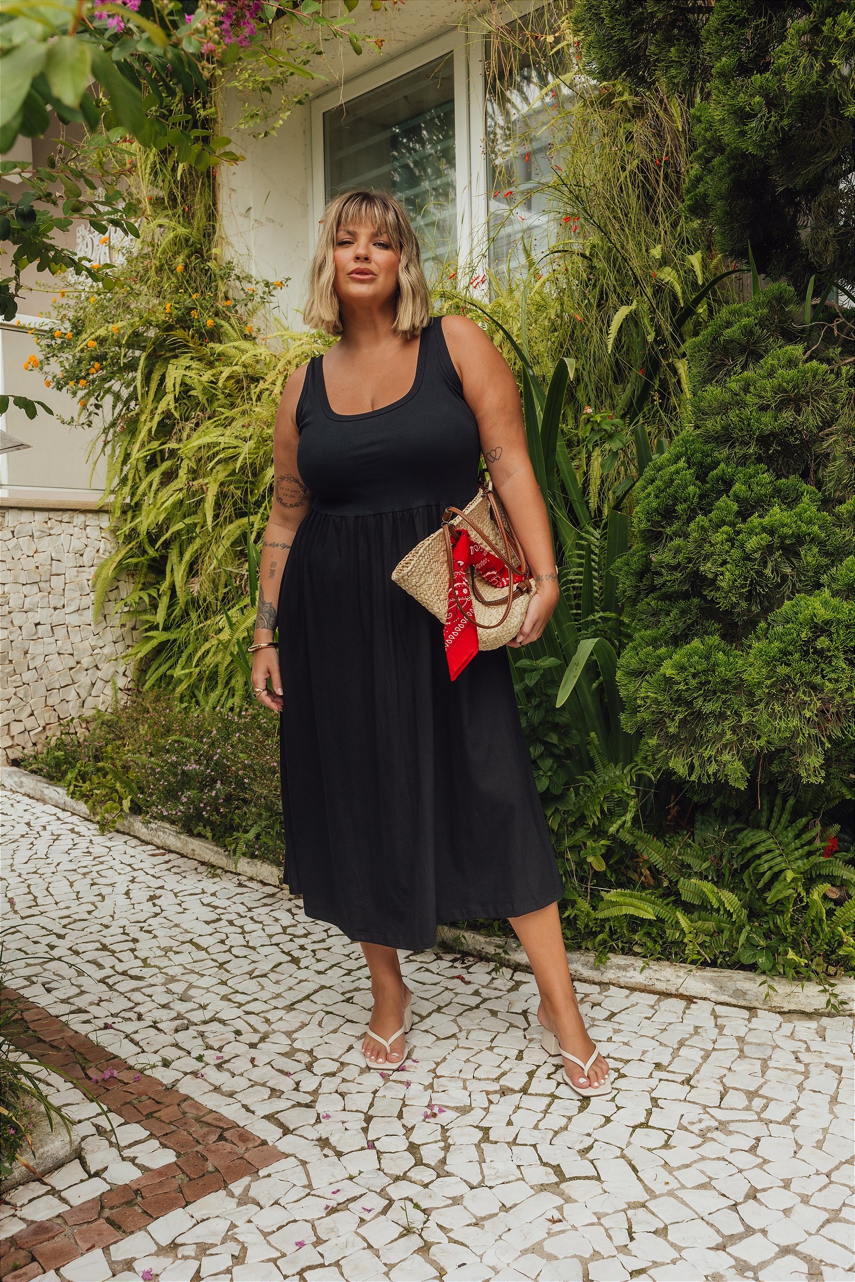 O Vestido Agatha na versão totalmente preta é sinônimo de elegância minimalista e versatilidade. A parte superior, confeccionada em malha canelada de alta qualidade, possui um design de regata com alças largas, oferecendo um ajuste perfeito e permitindo o uso confortável de sutiã. O preto, clássico e sofisticado, destaca-se por sua atemporalidade, sendo uma escolha certeira para diversas ocasiões.