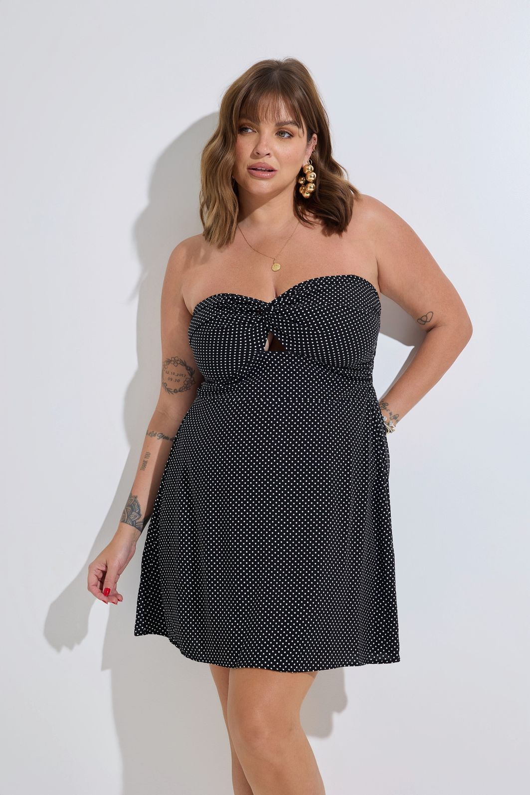 O Vestido Miami Poá Preto combina praticidade e estilo em uma proposta versátil para o dia a dia. O modelo tomara que caia conta com lastex nas costas, que garante firmeza no busto, ajuste confortável e caimento cinturado. Produzido em viscose leve com estampa de poá miúdo, traz o charme do clássico aliado a um toque moderno.